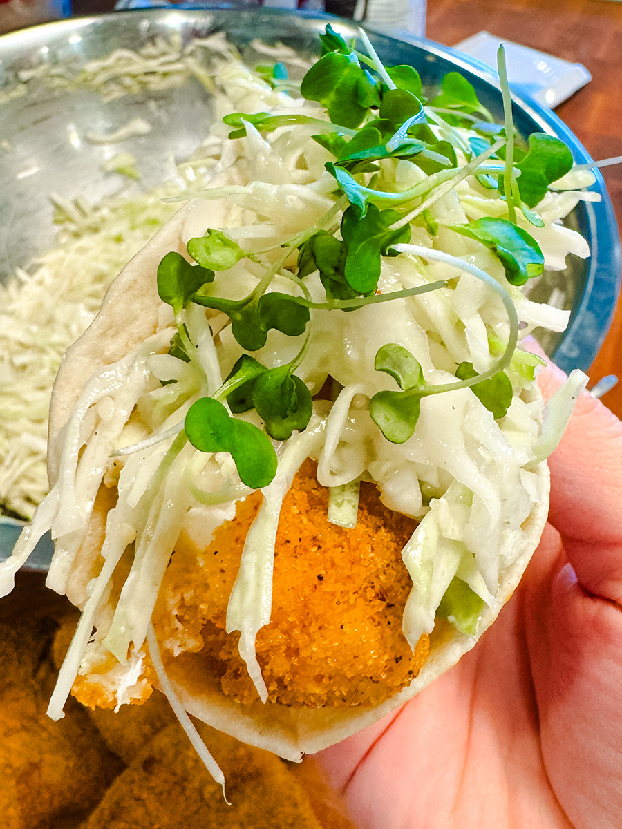 Tacos make regular appearances at our dinner table. It’s easy to give everyone a meal they’ll love, even the pickiest eaters. I shared this slaw on Saturday and it’s quickly become my new favorite—perfect in tacos, pitas, or wraps. The fish sticks take a little bit of extra time; if that’s not your thing you can use a simple air-fried fish or even frozen fish sticks. But they are worth it.