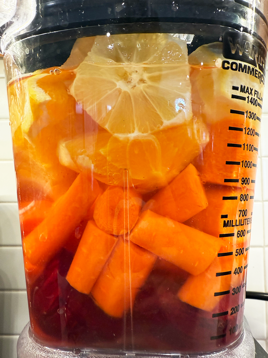 The most important part of this recipe is knowing you can mix and match the ingredients based on what you have. I had a LOT of carrots from my FreshDirect order the other day so I added almost all of them. Fresh ginger and turmeric add anti-inflammatory properties (not to mention incredible flavor), so use fresh here, not ground or jarred. Beets add color and more sweetness; you can make this with only beets and no carrots or vice versa. The world’s your oyster.