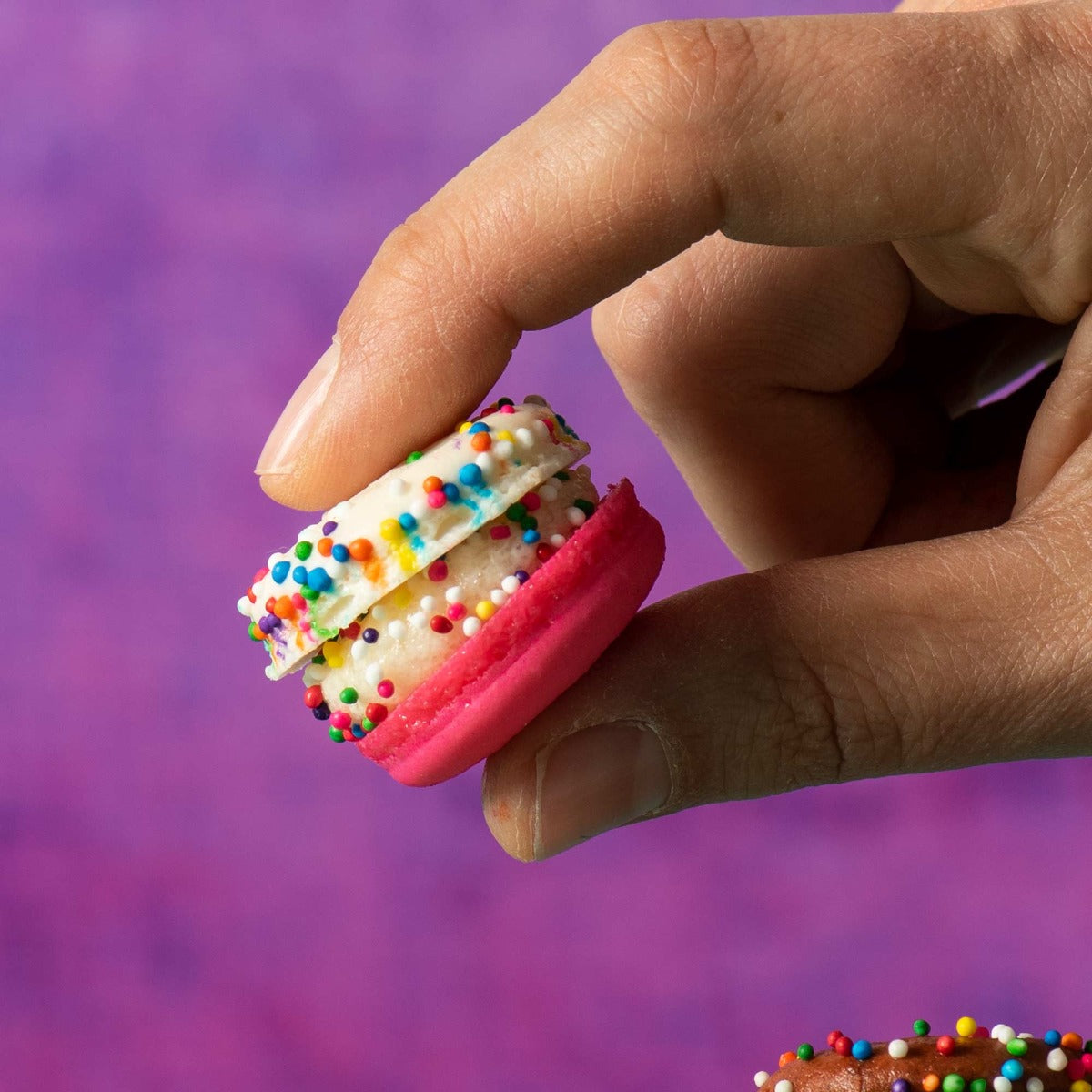 Pink & White Shell, filled with Sugar Cookie & Rainbow Nonpareil, topped with Rainbow Nonpareil. Made with Almond Flour.