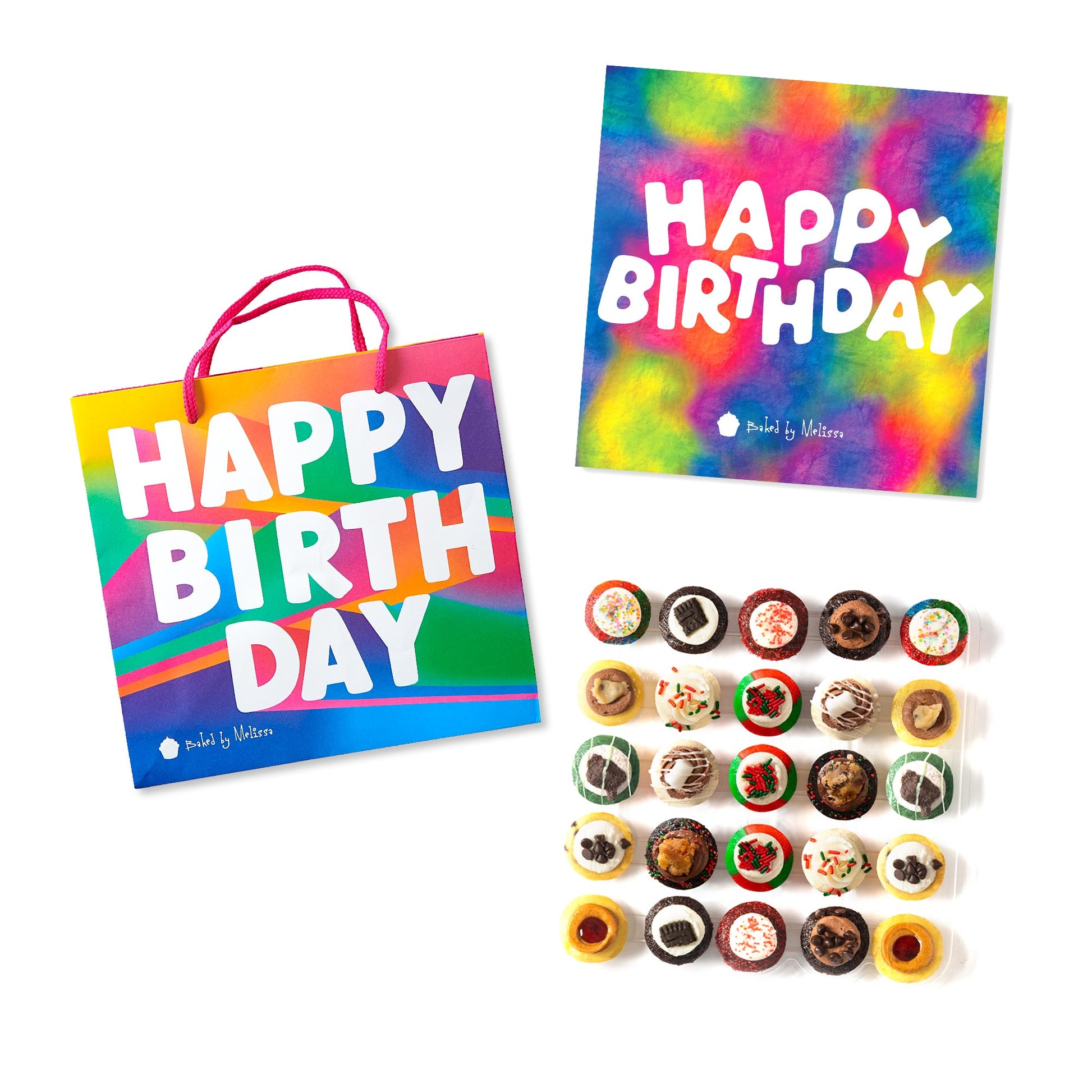 The ultimate birthday gift: 25 Latest & Greatest cupcakes in a groovy gift box, paired with our new birthday gift bag.