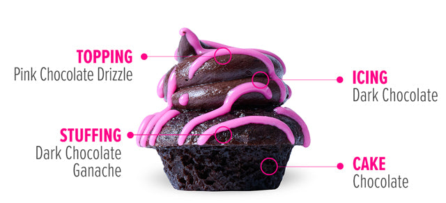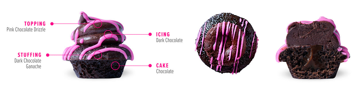 Chocolate Cake, stuffed with dark chocolate ganache, topped with dark chocolate icing and pink chocolate drizzle.