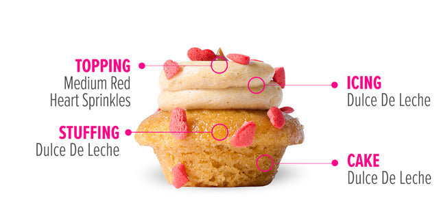 Dulce De Leche Cake, stuffed with dulce de leche, topped with dulce de leche icing and medium red heart sprinkles.