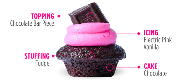 Chocolate Cake, stuffed with fudge, topped with electric pink vanilla icing and a chocolate bar piece.