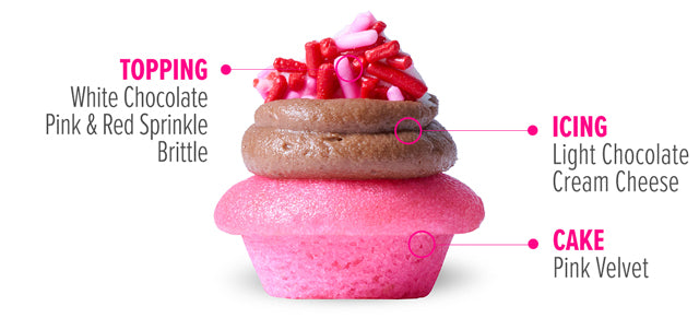 Pink Velvet cake, topped with light chocolate cream cheese icing and white chocolate pink and red sprinkle brittle.