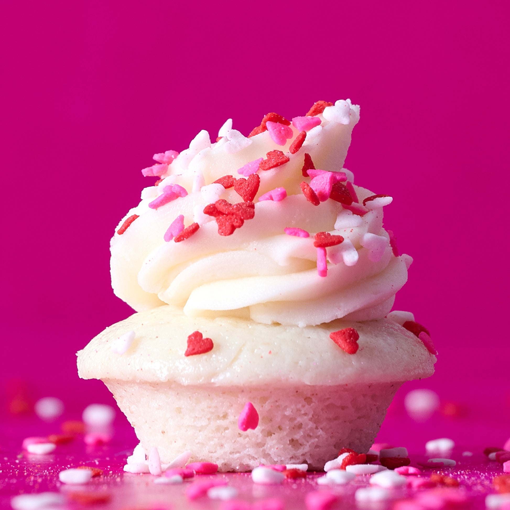 Red Velvet Cake, topped with cream cheese icing and red sugar heart sprinkle.
