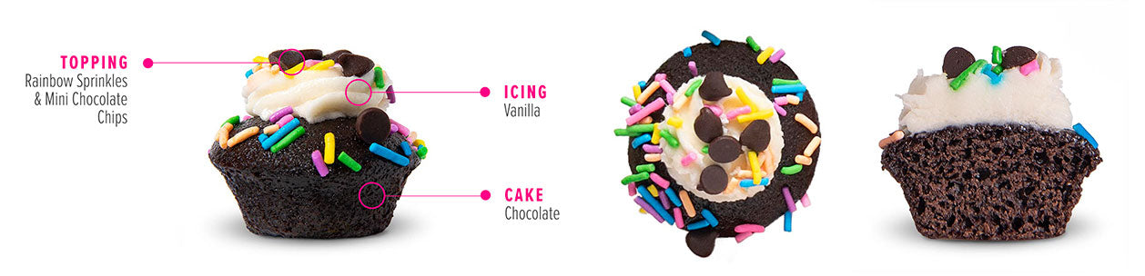 Chocolate Cake, Topped with Vanilla Icing, Rainbow Sprinkles & Mini Chocolate Chips