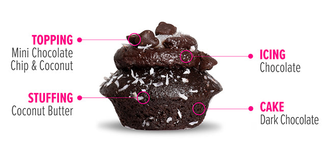 Dark Chocolate Cake, Stuffed with Coconut Butter, Topped with Chocolate Icing and Mini Chocolate Chips & Shredded Coconut. Contains Coconut.